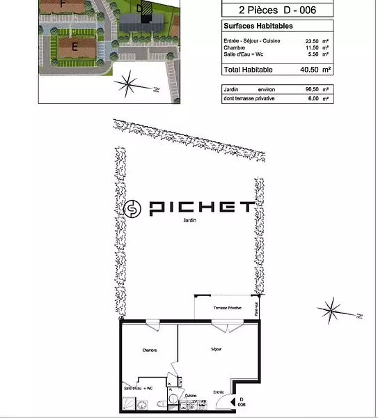 | 40,5 m² - 2 pièces - 1 chambre - ter. 96 m² | Rez-de-chaussée |