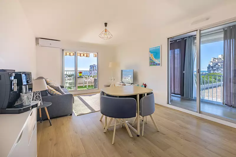 Vue mer, centre La Grande-Motte, appartement de 40m2 entièrement rénové et vendu meublé. Grande pièce de vie équipée d'une cuisine toute équipée donnant sur la terrasse de 10 m2 avec vue mer ainsi qu'une loggia fermée.