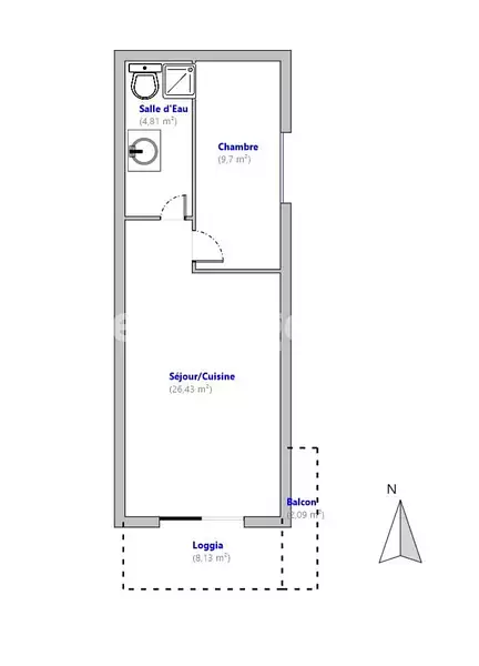 L'appartement se compose d'une entrée ouvrant sur une pièce de vie lumineuse de 26,43 m², avec coin cuisine. Il comprend également une chambre, une salle d'eau avec WC, ainsi qu'une loggia de 8,13m² ainsi qu'un balcon de 2,09m2.