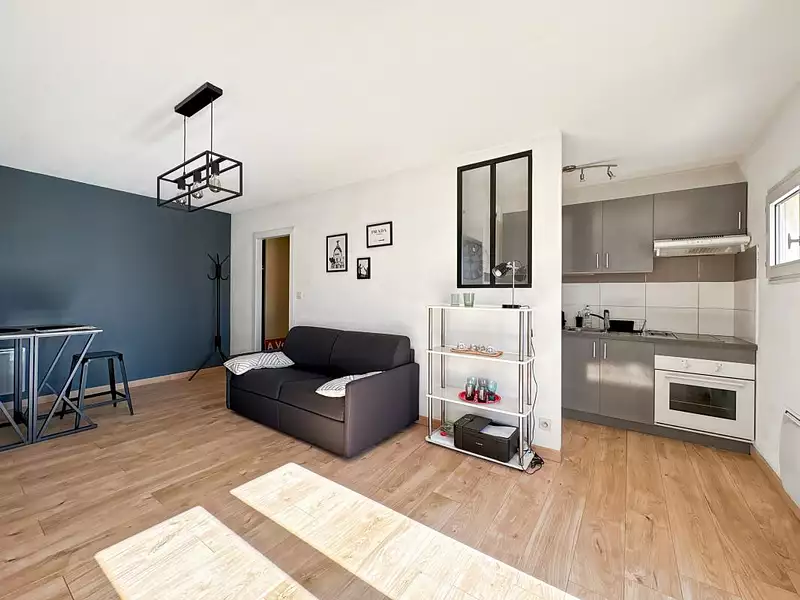 La cuisine ouverte, entièrement équipée, s'intègre harmonieusement à la pièce de vie. La chambre dispose d'un grand placard, et des rangements supplémentaires sont présents dès l'entrée.