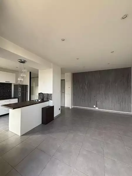 Porte blindée, séjour ouvert sur cuisine équipée (four, plaques) ilot central avec évier. 2 Grandes portes fenêtres donnent accès a un grand balcon avec assez d'espace pour placer une petite table et deux chaises. Carrelage au sol, spots au plafond. Couloir équipé de rangements sur mesures (penderies + placards a chaussures + emplacement lave-linge).