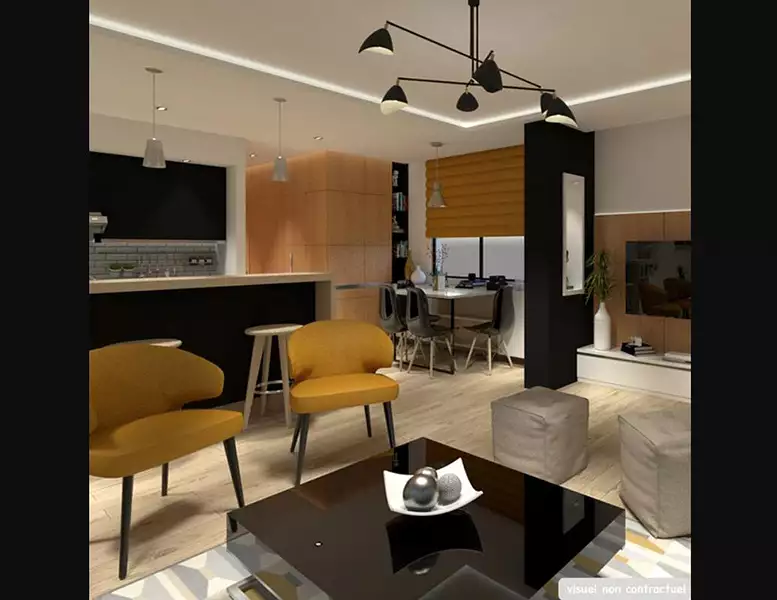 Il est composé d'un hall d'entrée avec rangements, une pièce de vie avec espace cuisine ouvert, le tout donnant sur le balcon avec cellier, une salle de bain avec WC et une chambre.