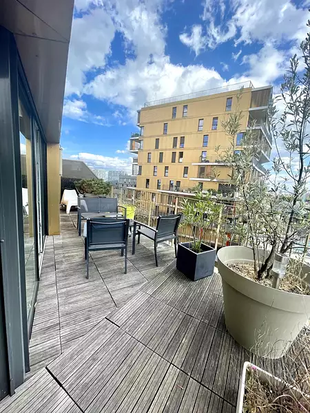 Situé au 11ème étage d'un immeuble construit en 2015, il bénéficie d'une terrasse de 23 m².