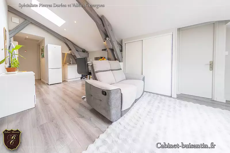 EXCLUSIVITE - LE BOIS D'OINGT - Idéalement situé avec commerces et commodités au pied de l'immeuble, il s'agit d'un appartement T2 au 3ème et dernier étage d'une bâtisse en pierres dorées, entièrement refait à neuf en 2020. Il comprend : entrée, cuisine équipée ouverte sur le séjour, chambre et salle d'eau avec wc. Surface au sol de 41.67 m2 (Loi Carrez 31.05 m2)