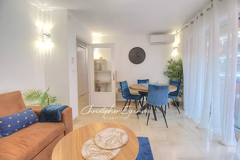 Situé dans une rue discrète perpendiculaire au Boulevard Albert 1er, à seulement quelques minutes à pied du Vieil Antibes et du bord de mer, cet appartement deux pièces entièrement rénové vous séduira par son agencement et sa situation.