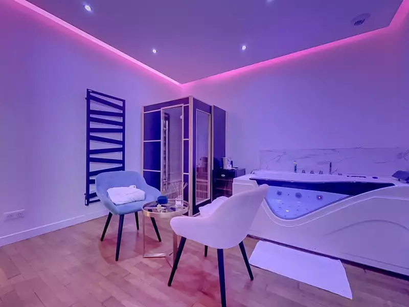 D'une seconde pièce d'exception dédiée au bien-être, équipée d'un sauna, d'une baignoire balnéothérapie moderne et d'une double douche pour plus de confort. Découvrez un véritable cocon de détente, une ambiance chaleureuse et raffinée sublimée par un éclairage d'ambiance tamisé.