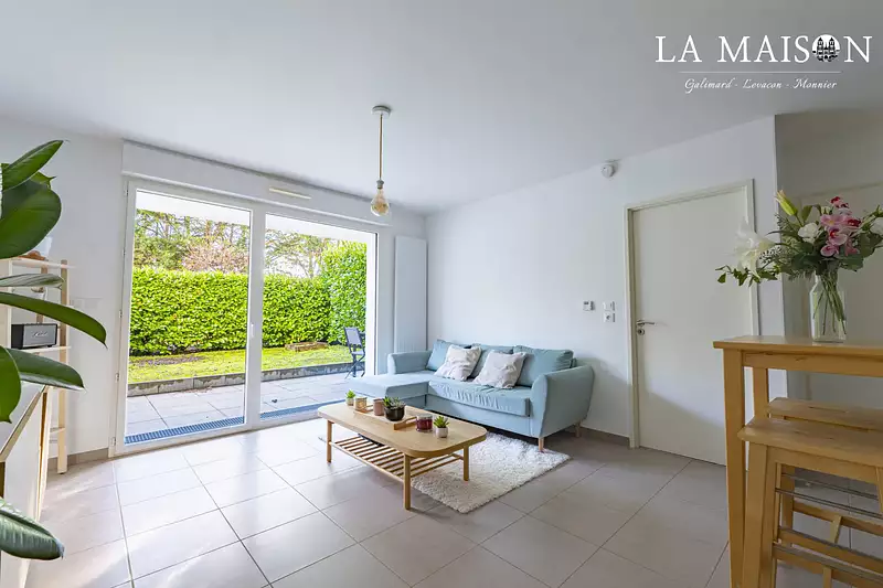 Ce bel appartement en rez-de-jardin est composé d'une entrée avec placard, d'un salon/sejour donnant sur une belle terrasse avec jardin, d'une cuisine ouverte et toute équipée, une grande salle de bain avec toilettes et une spacieuse chambre donnant sur l'extérieur.