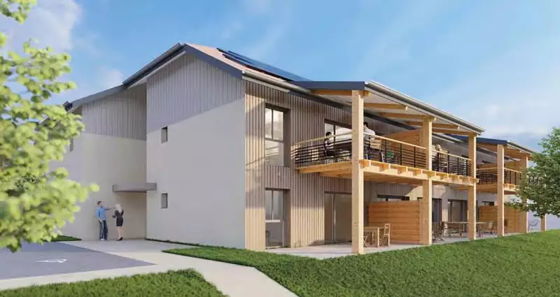 RESIDENCE: Un bâtiment décarboné, construction en bois et béton, chauffé aux énergies renouvelables qui s'inscrit parfaitement dans son environnement en harmonie avec le paysage rural. Les 14 appartements indépendants de type T2 sont des appartements meublés de 42,17 m2, prolongés d'une terrasse extérieure de 15 m2 où les occupants pourront profiter pleinement d'une vue dégagée. Les appartements sont situés de plain pied ou au 1 er étage avec ascenceur.