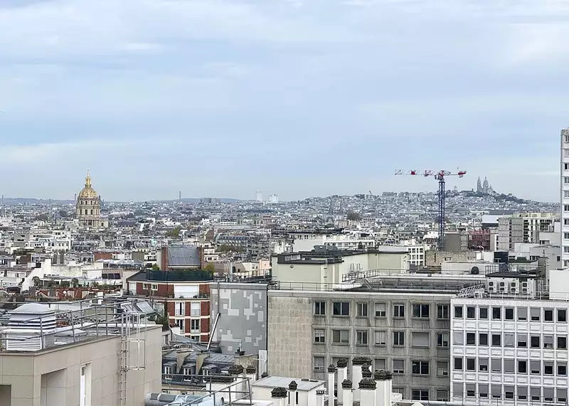 Un agréable balcon de 11m² offre une vue panoramique sur Paris et ses monuments : de la Tour Montparnasse au Sacré-Cœur, sans oublier la Tour Eiffel ou encore le Dôme des Invalides.