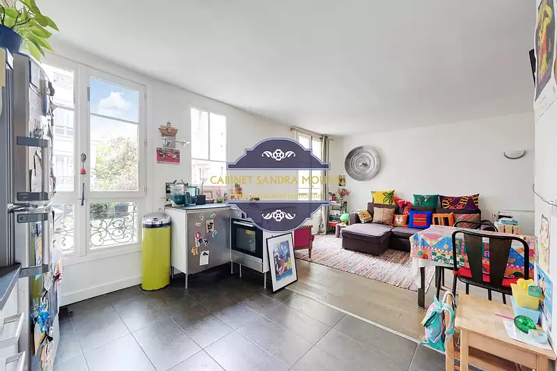 Exclusivité-Paris XIXème- Village Jourdain. Appartement de 2 pièces, de 43m2 loi carrez, en bon état général , au 1er étage d'un immeuble pierre de taille parfaitement sécurisé comprenant: une grande pièce principale avec cuisine ouverte et vue dégagée sur cour exposée Ouest, une belle chambre avec rangements, une salle de bains et WC. Appartement en double exposition traversante, au plan parfaitement optimisé, sans aucune perte d'espace.