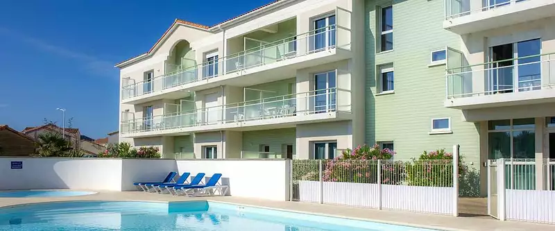 Située entre Saint-Jean-de-Monts et les Sables-d'Olonne, la résidence se compose d'appartements et de maisons individuelles jumelées et propose des logements du T2 de 35 m² à la maison T4 de 55 m² pouvant accueillir jusqu'à 8 personnes, prolongés d'un balcon ou d'une terrasse. La résidence propose également des espaces communs de qualité : espace petit-déjeuner, piscine extérieure chauffée, sauna, bains à remous, parking extérieur...