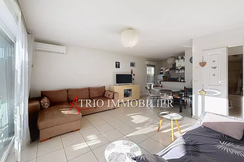 Une entrée avec placard dessert la chambre, la salle de bain, les toilettes et la pièce à vivre. Cette dernière spacieuse est facilement aménageable avec le coin cuisine en retrait donnant sur un balcon ouest. La terrasse exposée sud offre une surface protégée ainsi qu'un espace repas et un autre plus repos devant la chambre. Un double stationnement en sous-sol complète ce bien.