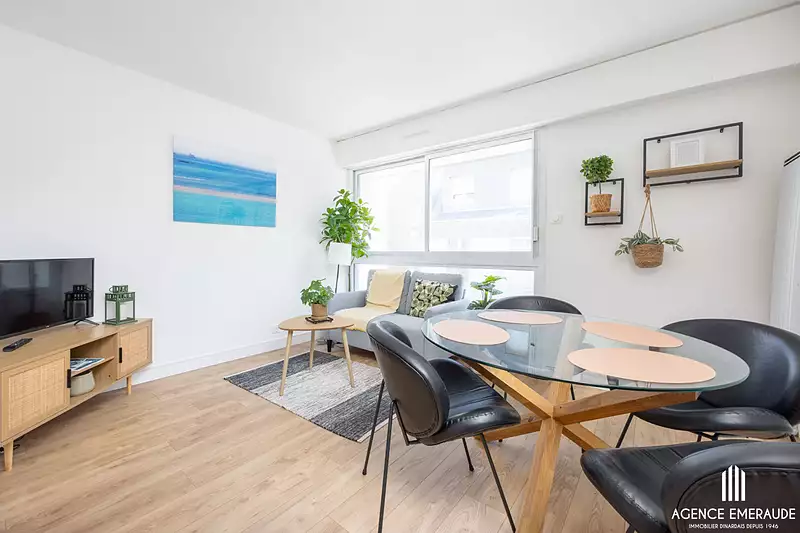 A vendre hyper centre de DINARD, appartement de type T1 bis, situé au 2nd étage d'un immeuble de standing avec ascenseur, composé de : entrée, cuisine aménagée, équipée, séjour, salon, 2 chambres cabines, salle d'eau-wc. L'appartement est en parfait état, prêt à vivre. La plage de l'écluse est à 50 mètres, les commerces sont au pied de l'immeuble. Pour plus d'informations ou demande de visites, contactez l'agence emeraude 48 rue Levavasseur 35800 DINARD. Référence 7426. (4.80 % honoraires TTC à la charge de l'acquéreur.) Copropriété de 50 lots - dont 18 lots habitation. (Pas de procédure en cours). Charges annuelles : 1080 euros.