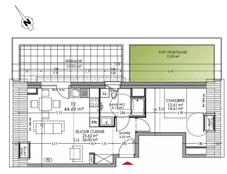 Ce 2P d’une superficie de 44,69m² habitables et 50,75m² au sol se compose comme suit : une entrée avec placard, un séjour avec cuisine ouverte, une terrasse de 15,93m², une salle d’eau avec wc et une chambre.