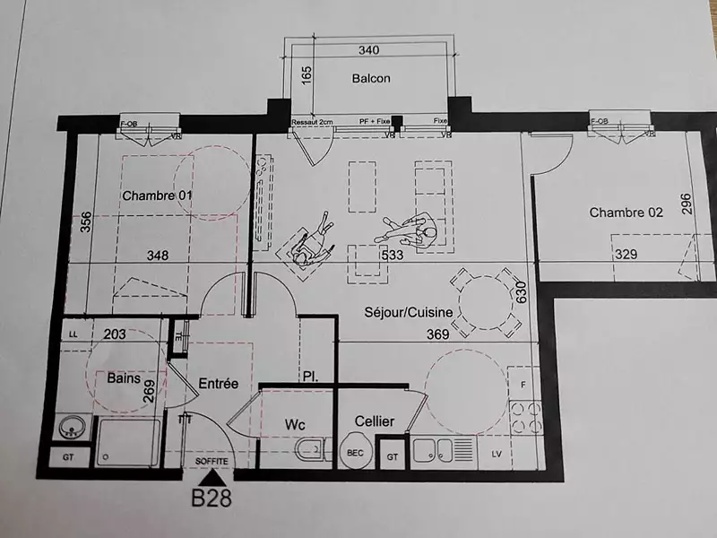 Spacieuse pièce de vie lumineuse avec cuisine ouverte et son cellier
