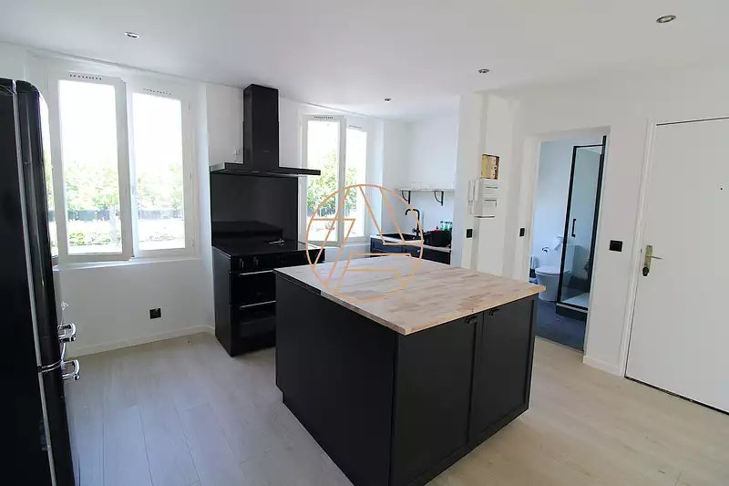 Une entrée desservant le séjour avec parquet et une cuisine aménagée et équipée, une salle d'eau moderne avec Wc, une chambre avec dressing.