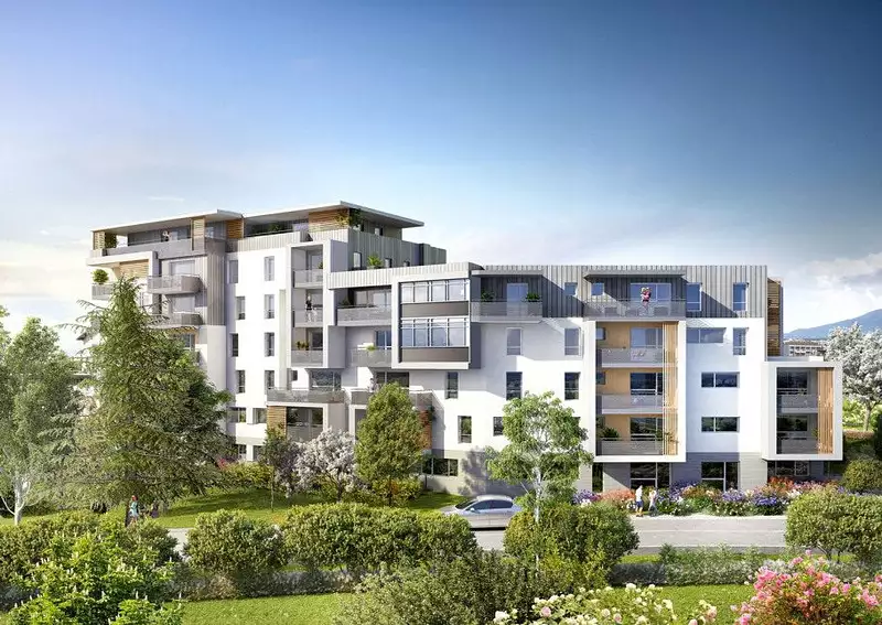Appartement T2 neuf de 45.28 m² à Annemasse avec un Séjour / cuisine de 27.94m², une chambre de 11.63m², une salle de bain avec wc de 5.71m² et un accès au balcon exposé Sud de 5.54m².