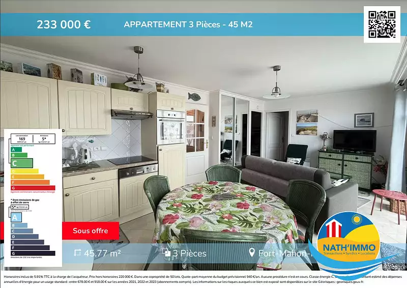 Honoraires inclus de 5.91% TTC à la charge de l'acquéreur. Prix hors honoraires 220 000 €. Dans une copropriété de 50 lots. Quote-part moyenne du budget prévisionnel 940 €/an. Aucune procédure n'est en cours. Classe énergie C, Classe climat A Montant estimé des dépenses annuelles d'énergie pour un usage standard : entre 678.00 € et 918.00 € sur les années 2021, 2022 et 2023 (abonnements compris). Les informations sur les risques auxquels ce bien est exposé sont disponibles sur le site Géorisques : georisques.gouv.fr.