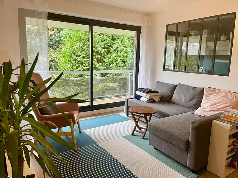 Le séjour, lumineux et exposé Sud-Est, s'ouvre sur une terrasse de 11 m² sans vis-à-vis, offrant une vue dégagée sur la verdure. La cuisine séparée, aménagée et équipée, communique avec le séjour grâce à une verrière élégante, apportant modernité et convivialité.