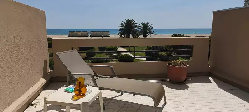 Rare spacieux deux pièces cabine à la belle terrasse face mer. Cuisine à l'américaine sur séjour, chambre et véritable cabine avec porte et fenêtre, salle d'eau neuve, toilette indépendant. cellier. Menuiserie neuves - ravalement 2023 Sophie DUFOSSE