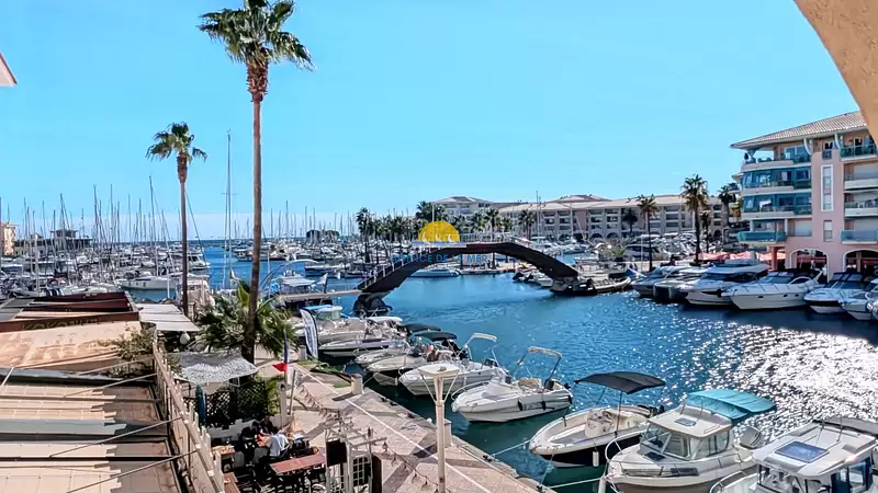 PORT FREJUS : EN EXCLUSIVITE !! Beau 2 piéces de 46m2 vue sur la Marina jusqu'a la mer, en étage avec asc, résidence prisée composé de : hall avec placard, séjour climatisé donnant sur terrasse sud, cuisine, salle d'eau, wc ind. chambre avec placard, Garage.