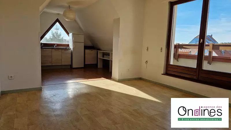 À vendre à Haguenau (67500) : appartement de 47 m² au 2e étage. Il compte une pièce à vivre, une chambre, une cuisine aménagée équipée, une salle de bains et des toilettes. En annexe, on trouve un balcon (5 m²), une place de parking et une cave. Vue dégagée.