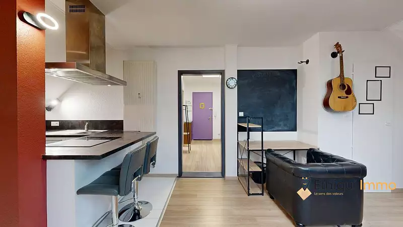 L'appartement se compose d'une entrée, d'une cuisine équipée ouverte sur un séjour, d'une chambre d'environ 11 m², d'une buanderie et d'une salle d'eau avec WC. Le logement est complété par une place de parking privative et une cave. Son agencement fonctionnel et sa situation privilégiée en font un bien parfaitement adapté à un premier achat ou à un investissement locatif.