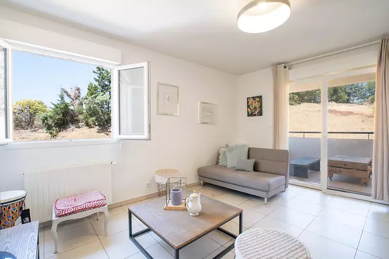 Implanté dans un immeuble de 6 niveaux, au deuxième étage coté colline, ce T2 de 46m2 est en excellent état et sans vis à vis.