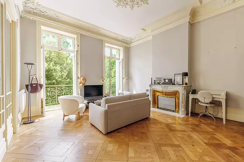 JARDIN PUBLIC- Au premier étage d'un ancien hôtel particulier du XIXème, magnifique 2 pièces comprenant: une grande pièce de vie, une cuisine équipée ouverte, une chambre, un espace bureau, une salle de bain et un balcon filant offrant une très belle vue dégagée sur le Jardin Public. Charme de l'ancien, lumineux, beau volume.