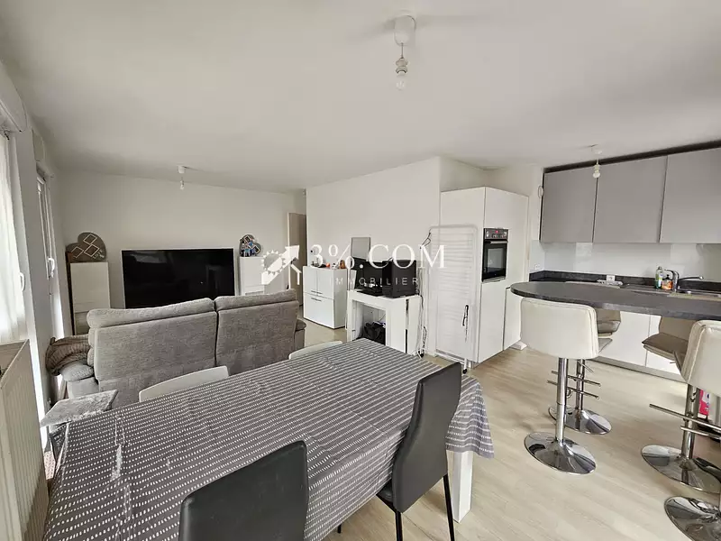 Salon salle à manger de 22m2 ouvert sur la cuisine équipée.