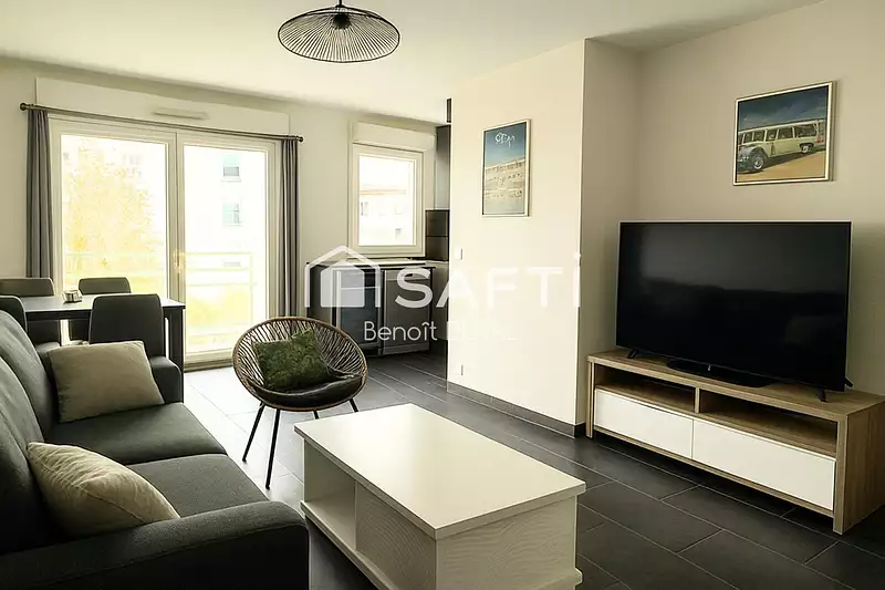 Imaginez un appartement où chaque espace a été pensé pour votre confort. Ce T2 de 47 m², situé au 1er étage d’une résidence calme, vous accueille avec un séjour lumineux ouvert sur une terrasse parfaite pour vos petits-déjeuners au soleil. La cuisine moderne s’intègre harmonieusement et la chambre spacieuse, avec son placard intégré, donne accès à une seconde terrasse, un vrai bonus. La salle d’eau contemporaine et le WC séparé complètent ce logement pratique et fonctionnel.