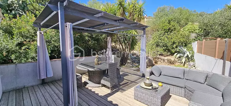 Le jardin est agencé en restanque il comprend une remise en dur de 9 m2 et un espace sous tonnelle avec une jolie terrasse offrant un espace de vie supplémentaire.