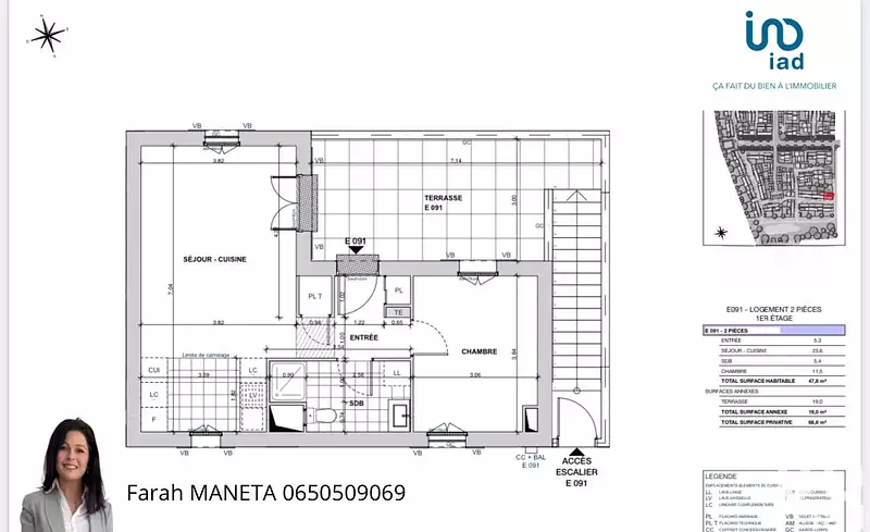 Il se compose d'UNE ENTRÉE avec PLACARD - SÉJOUR - CUISINE OUVERTE - UNE CHAMBRE - UNE SALLE D'EAU AVEC WC - UNE GRANDE TERRASSE DE 19M2 environ.