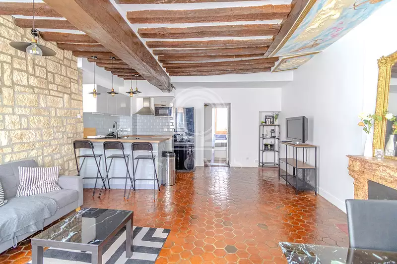Au 1er étage d'un petit immeuble, charmant 2 pièces de 49m2 comprenant une entrée, un vaste séjour salle à manger avec cheminée, tomettes d'origine et poutres apparentes, une cuisine américaine entièrement équipée, une chambre donnant accès à une terrasse sans vis à vis de 7m2 et exposée SUD-EST ainsi qu'une salle d'eau récente avec sèche serviette, machine à laver et WC.