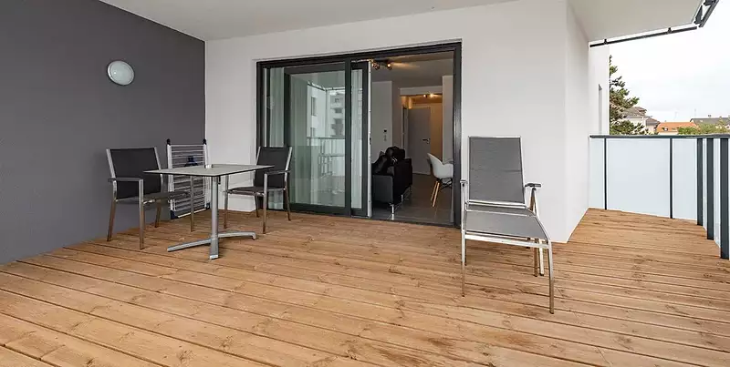 Idéalement situé, proche du Parc des Eaux Vives, appartement de type 2 pièces d'une superficie de 48.84 m² avec sa terrasse de 19 m² situé au 1er étage, comprenant :