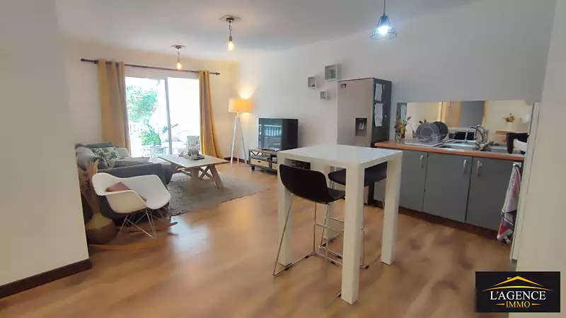 Ce spacieux F2 de 49 m² comprend une entrée, un séjour avec cuisine équipée, une grande chambre avec placards, une salle de bain et sanitaire, prolongée d'une buanderie. Un espace pouvant servir de bureau. Une terrasse couverte de 18 m² offre une vue agréable dans un cadre végétal.