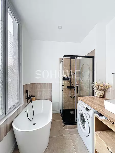 La salle de bains, équipée d'une douche et d'une baignoire, complète ce logement pratique et bien pensé.