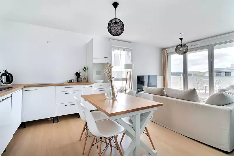 | Cuisine ouverte, équipée | Séjour de 27 m² |