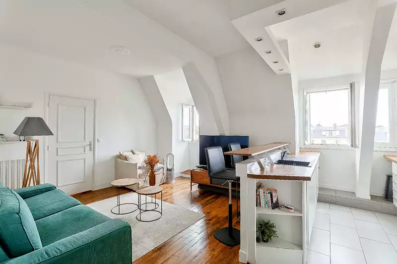 Situé au 7ème étage d'un immeuble de l'entre deux guerres, mêlant une architecture Art Nouveau et Art Déco épurés, cet appartement de 50 m², en parfait état, se compose d'une entrée offrant un vaste espace bureau, d'un séjour, d'une cuisine ouverte meublée et équipée, d'une chambre et d'une salle de douche avec WC. L'appartement en étage élevé, sans aucun vis à vis, en parfait état, offre une très belle luminosité et une vue sur la Tour Eiffel. Un appartement offrant du potentiel via la création d'une seconde chambre. A visiter sans plus tarder! Copropriété de 50 lots - dont 30 lots habitation. (Pas de procédure en cours). Charges annuelles : 2208 euros.