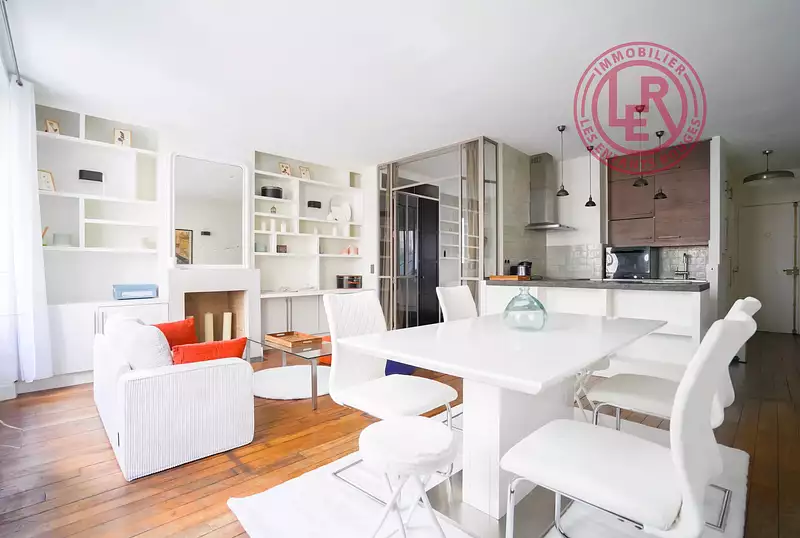 Cheminée, parquet massif, aménagement sur mesure, sans perte d'espace et finissions soignées.