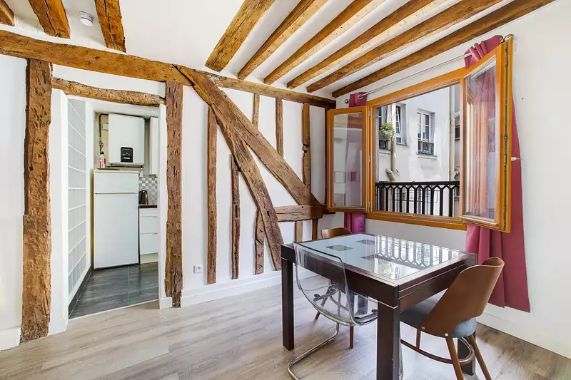 Poutres apparentes, pierres naturelles et colombages d’époque.