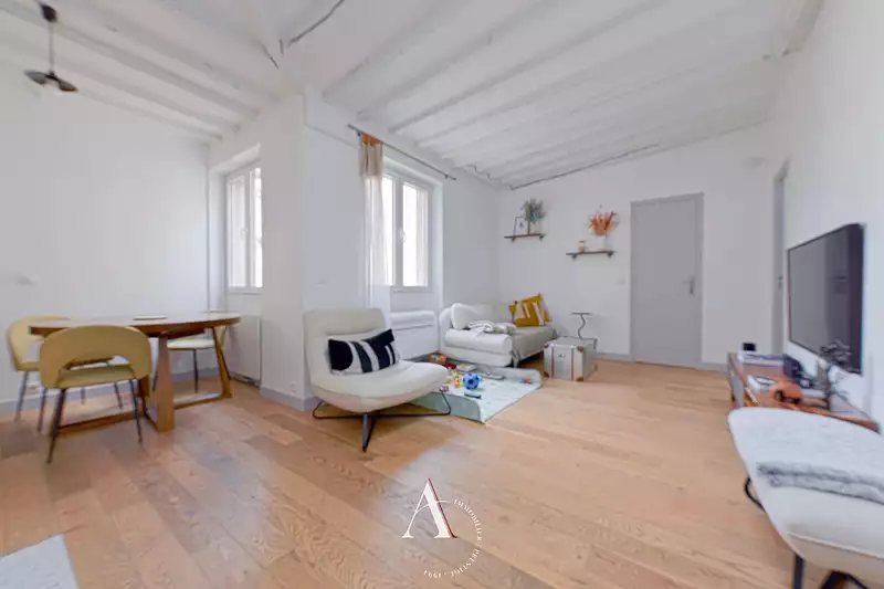 Au 6e et dernier étage avec ascenseur d'un bel immeuble en Pierre de Taille. Appartement 3 pièces de 50 m² calme et lumineux, comprenant une entrée, un séjour avec cuisine ouverte, 2 chambres dont une avec dressing et une salle d'eau avec wc. Une cave. Excellent état général. Belle hauteur sous plafond, poutres apparentes.