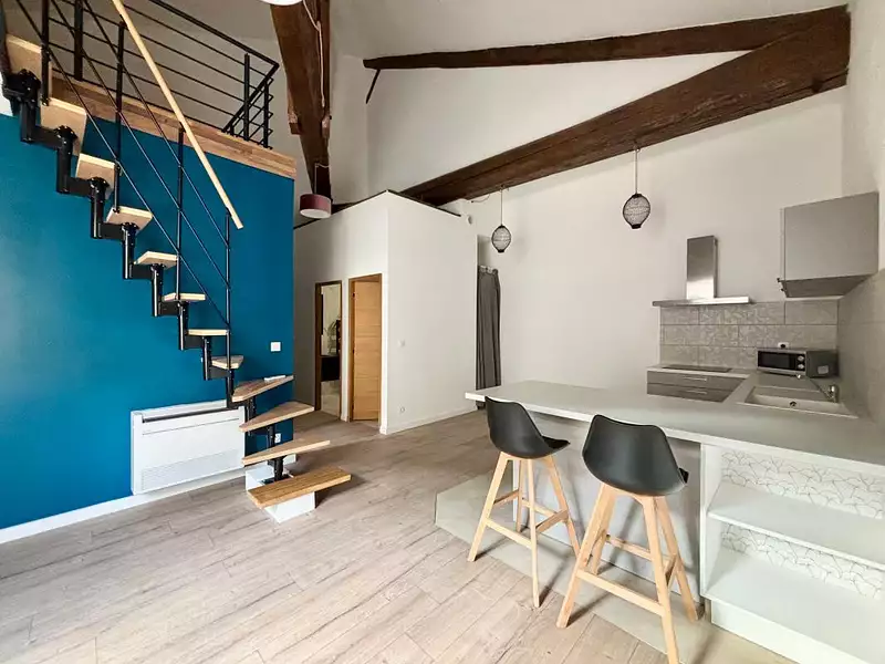 Situé en plein centre ville de Poussan et au sein d'un immeuble de caractère, superbe appartement de 50m2 en duplex composé d'une entrée desservant : une salle d'eau, un wc indépendant, une spacieuse chambre avec dressing, une belle pièce à vivre avec cuisine aménagée et une mezzanine.