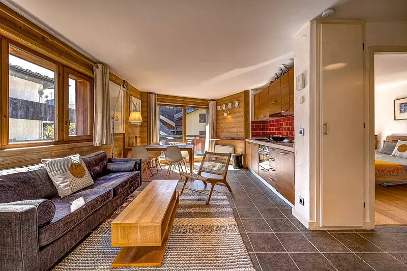 L'appartement a été magnifiquement rénové dans un style montagnard et dispose d'un espace de vie ouvert et spacieux. Les deux chambres ont accès aux balcons, tout comme le salon. L'appartement est équipé d'un espace de rangement et d'un parking souterrain privé.