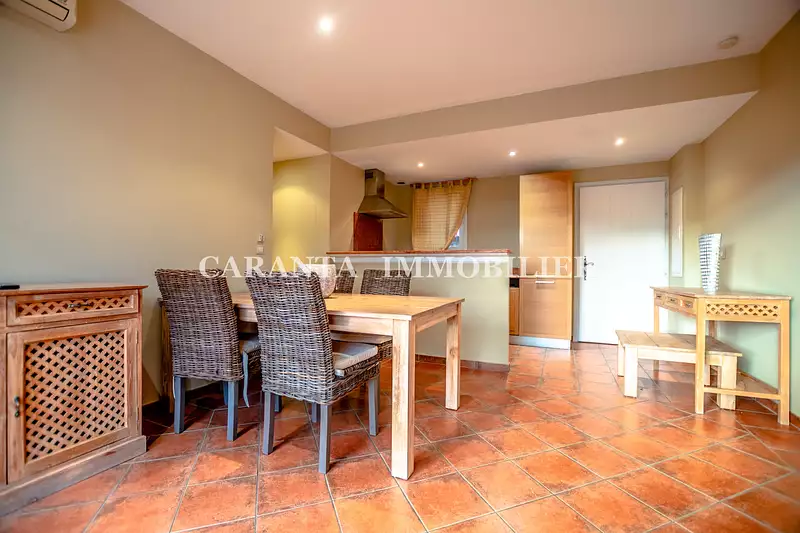 Il se compose d'un séjour climatisé avec cuisine US équipée, le tout ouvrant sur terrasse, 2 chambres climatisées avec placards ouvrant sur la terrasse, une salle d'eau, 1 WC séparé, placards. Place de parking privative.