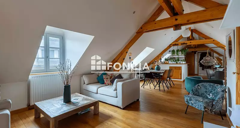 L'appartement est au dernier étage, belle luminosité, de beaux parquets et poutres en font un lieu unique et chaleureux. Cuisine aménagée, deux chambres. Rangements et parking. Double vitrage.