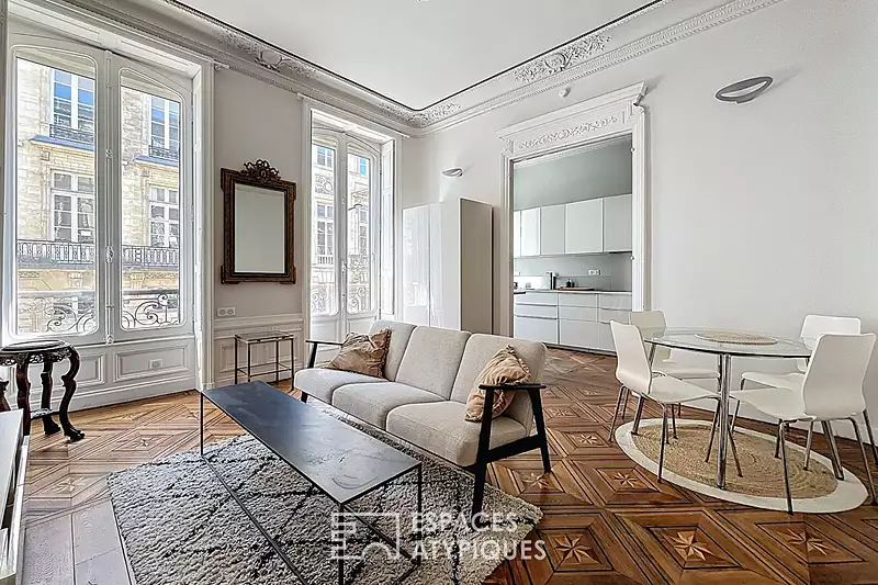 Situé au premier étage d'un immeuble en pierre typique du centre historique de Bordeaux, cet appartement de 52 m² développe deux pièces aux volumes généreux. Implanté dans le prestigieux Triangle d'Or, entre la place de la Bourse et le Grand Théâtre, il bénéficie d'un emplacement rare et recherché, à proximité immédiate des commerces, transports et lieux culturels emblématiques de la ville. Le séjour profite d'une belle hauteur sous plafond sublimée par des moulures d'origine et des corniches travaillées, tandis que le parquet à motif étoilé, en bois massif marqueté, confère à l'ensemble un cachet singulier. L'orientation plein sud des grandes fenêtres en bois double vitrage baigne les pièces de lumière naturelle tout au long de la journée. La cuisine séparée, entièrement aménagée et équipée, s'inscrit dans une esthétique contemporaine et épurée. Une chambre calme à l'arrière, une salle d'eau au design sobre et soigné, ainsi qu'un espace de rangement en cave viennent compléter les prestations. A l'extérieur, un balcon filant d'environ 2 m² accessible depuis le séjour permet d'apprécier la vue sur l'architecture classique du centre-ville bordelais, tout en profitant d'un espace intime au coeur de l'effervescence urbaine. Le cadre de vie est à la fois vivant et feutré, dans un quartier historique alliant élégance et confort de vie. Le diagnostic de performance énergétique (DPE) est classé en catégorie D, avec un chauffage tout électrique. Ce bien rare par sa localisation, son cachet et ses finitions de qualité constitue une opportunité idéale pour un pied-à-terre de caractère ou une résidence principale dans l'un des secteurs les plus convoités de Bordeaux. CLASSE ÉNERGIE : D / CLASSE CLIMAT : B. Montant moyen estimé des dépenses annuelles d'énergie pour un usage standard, établi à partir des prix de l'énergie de l'année 2021 : entre 780 et 1090 euros Arthur BLANC (EI) Agent Commercial: 07 81 54 64 43 / numéro RSAC: 895 063 691 Bordeaux Copropriété de 8 lots (Pas de procédure en cours). Charges annuelles : 600 euros. Arthur BLANC (EI) Agent Commercial - Numéro RSAC : - .
