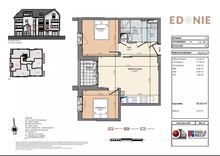 | 53 m² - 3 pièces - 2 chambres | 1er étage avec ascenseur |