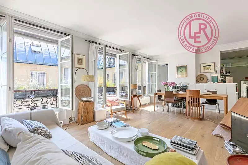 Exclusivité / Au 5ème étage avec ascenseur d'une belle copropriété de la rue Beaurepaire, un appartement de 2 pièces de 53m2 comprenant un grand séjour / salle à manger avec 3 fenêtres plein Sud, côté cour, une cuisine semi-ouverte entièrement équipée, une belle chambre avec sa salle de bains, des toilettes séparées et un cellier.