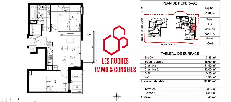 | 54 m² - 3 pièces - 2 chambres | 4ème étage avec ascenseur |